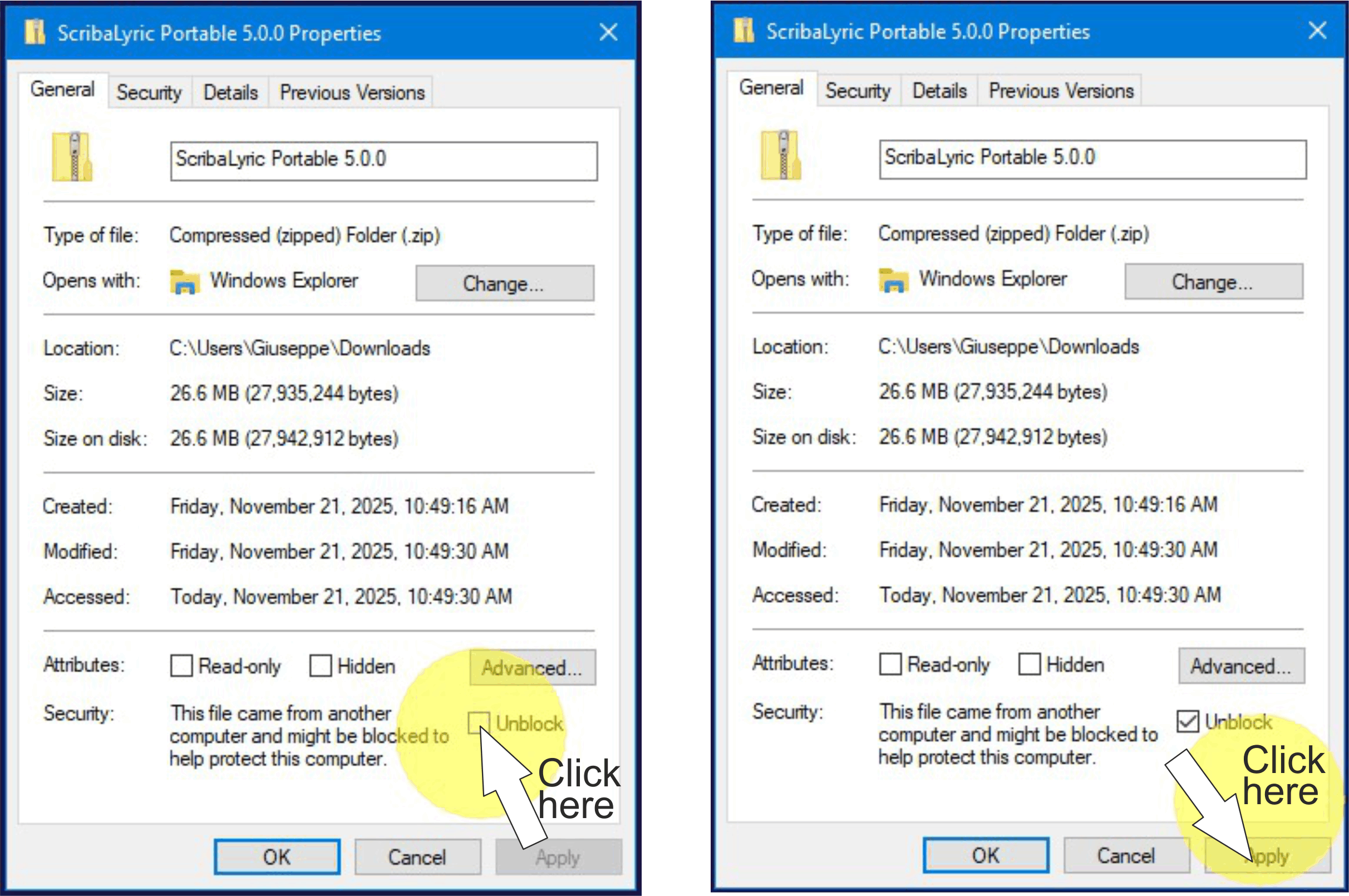 Starting with version 5.0.0, the Scriba Lyric software is also available in a 'Portable' version. This means that it doesn't need to be installed on Windows to use it; all you need to do is have the folder containing the application files on your PC. The download process will download a zip file containing all the application files to your PC. Once the zip file is downloaded, simply extract its contents (unzip the file). This will create a folder with the same name as the downloaded zip file. This folder will contain all the application files. To launch the application, simply navigate to the created folder and double-click the ScribaLyric file. Important: since files downloaded from the web have a block flag, before unzipping the downloaded file you will need to cancel this block by changing a flag relating to the file properties. To unblock, right-click the downloaded file and select "Properties" from the context menu. In the dialog box that appears, click the "General" tab and then check the "Unblock" checkbox at the bottom. To unblock, left-click the "Unblock" text next to the checkbox. A checkmark will appear in the previously empty box. Once the "Unblock" checkbox is checked, you'll need to unzip the file.
