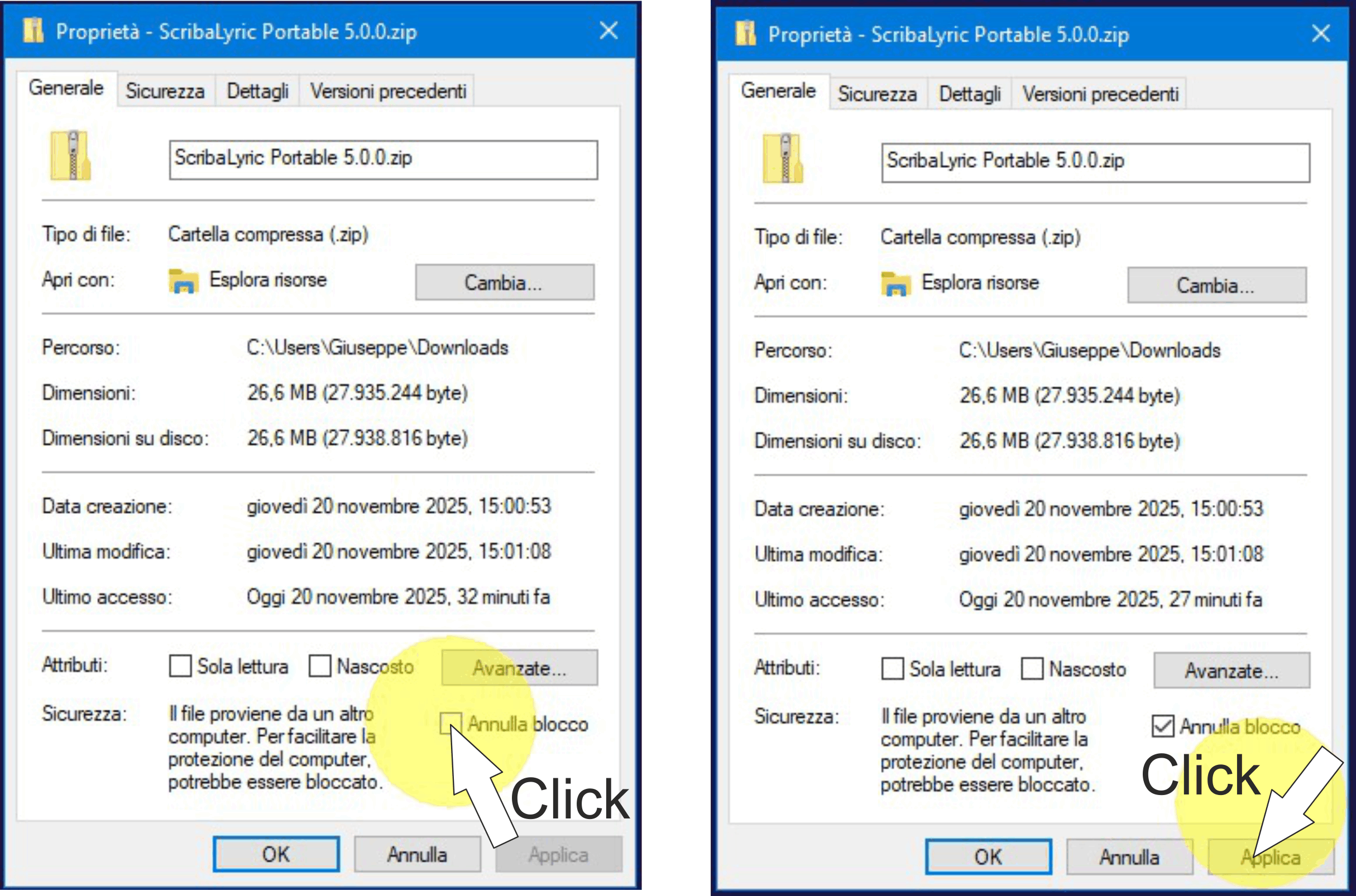 dalla versione 5.0.0 il software Scriba Lyric è distribuito anche in versione 'Portable'. Questo vuol dire che per il suo utilizzo non è necessario eseguire una sua installazione su Windows bensì è sufficiente che sul proprio PC sia presente la cartella contenete i files dell'applicazione. Tramite l'operazione di download si scaricherà sul proprio PC un file zippato (file di tipo zip) contenente al suo interno tutti i files dell'applicazione. Una volta scaricato lo zip file sarà sufficiente estrarne il contenuto (unzippare il file). Questa operazione creerà una cartella avente lo stesso nome del file zip scaricato. All'interno della cartella saranno presenti tutti i files dell'applicazione. Per lanciare l'applicazione sarà sufficiente entrare nella cartella creata e fare doppio click sul file di nome ScribaLyric. Importante: poichè i files scaricati dal web presentano un flag di blocco, prima di unzippare il file scaricato sarà necessario annullare tale blocco modificando un flag relativo alle proprietà del file. Per annullare il blocco bisognerà cliccare con il pulsante destro del mouse sul file scaricato dal web quindi selezionare la voce 'Proprietà' dal menù contestuale che sarà visualizzato. Nella finestra di dialogo visualizzata cliccare sul tab 'Generale' e quindi nella parte in basso inserire un flag sul check box (casella di controllo) di nome 'Annulla blocco'. Per inserire il flag cliccare con il sinistro del mouse sulla scritta 'Annulla il blocco' presente accanto al quadratino del check box. L'inserimento del flag sarà visualizzato con un segno di spunta visualizzato all'interno del quadratino precedentemento vuoto. Inserito il segno di spunta al check box di nome 'Annulla blocco' bisognerà unzippare il file.