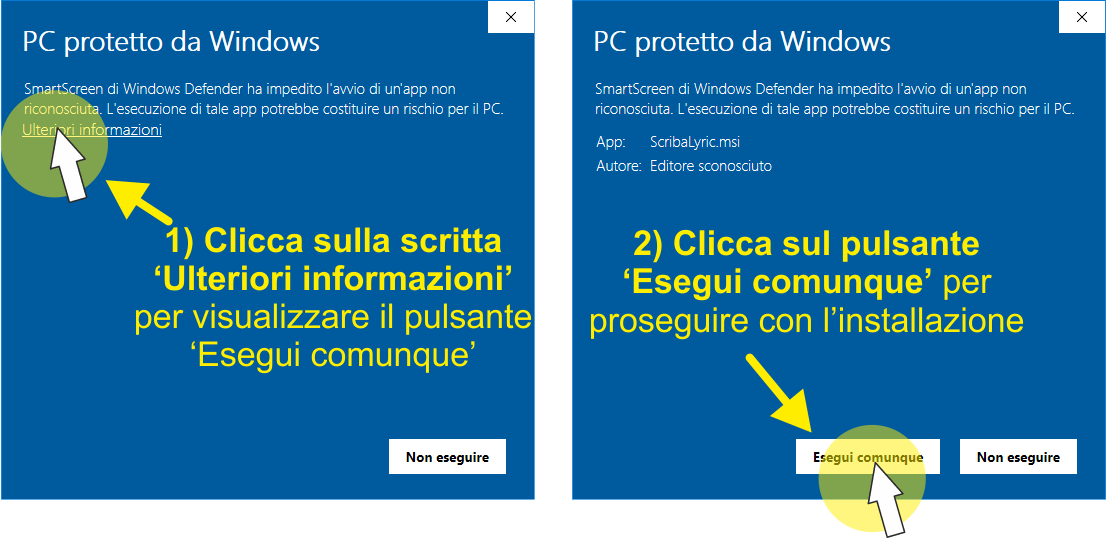 ATTENZIONE: Se utilizzi WINDOWS 10/11, dopo aver scaricato il file di installazione, nel momento in cui lo lanci per eseguire l'installazione, potrebbe apparire il messaggio 'PC protetto da Windows' con il pulsante 'Non eseguire' (vedi immagine sotto a sinistra). Questo messaggio è normale! Per proseguire con l'installazione, clicca sul link 'Ulteriori informazioni'. Sarà visualizzato il pulsante 'Esegui comunque' (vedi immagine sotto a destra). Per installare il software clicca sul pulsante 'Esegui comunque'.